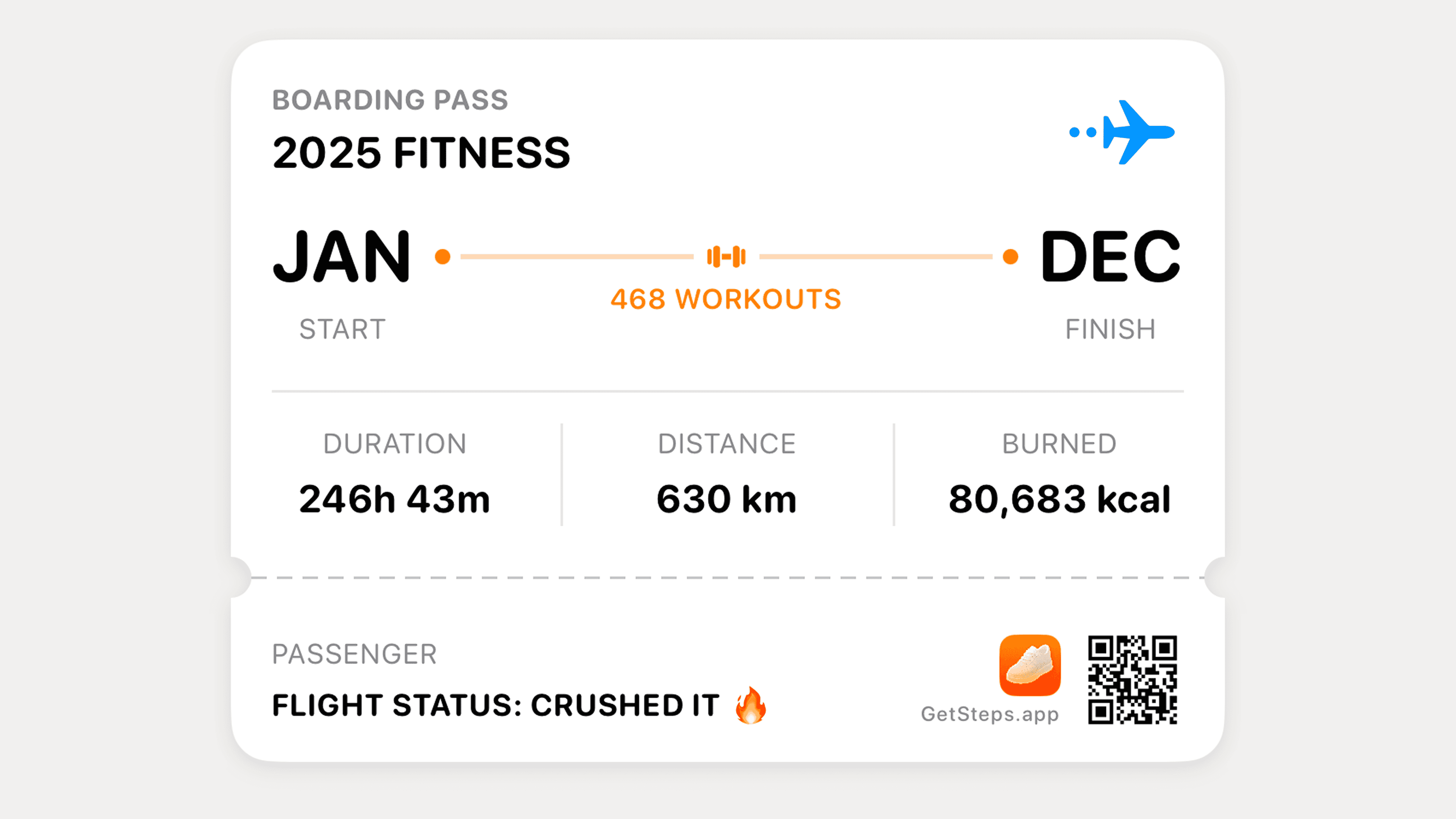 Flight Ticket Workouts Card Your workout statistics presented as a boarding pass, perfect for sharing your fitness journey.